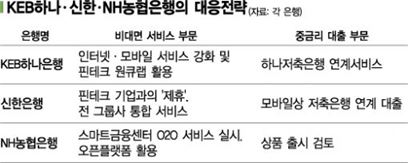 [아시아경제 조은임 기자]인터넷전문은행의 예비인가 접수가 시작되면서 은행권 전반에 긴장감이 감돌고 있다. 이번 인터넷전문은행 컨소시엄에 참여하지 않은 KEB하나ㆍ신한 ㆍNH농협은행은 기존 모바일ㆍ온라인 서비스를 강화하는 동시에 중금리 대출에도 역량을 집중하고 있다. 인터넷전문은행이 비대면 서비스로 인한 '편의성'과 중금리 대출 상품으로 '틈새시장'을 노릴 것으로 예상되자 이에 발빠르게 대응하는 것이다. 1일 금융권에 따르면 KEB하나은행은 내달부터 하나저축은행과의 연계대출 서비스를 시작한다. 시중은행에서 대출이 불가한 고객이 은행 창구에서 바로 저축은행 대출을 받을 수 있도록 하는 것이다. 지난 7월 출시한 연 6~10% 중금리 대출상품 '하나 이지세이브론'에 이어 중금리 대출을 강화한다는 의미도 있다. 기존에 제공하던 인터넷ㆍ모바일 서비스도 대폭 강화하고 나섰다. 콘텐츠와 상품, 서비스 품질 등 전반적 채널에 대한 업그레이드를 진행 중이다. 오는 12월 도입되는 비대면실명 확인제도에 대비하는 것이다. 또 원큐랩에 입주해 있는 핀테크 업체와의 협업도 진행하고 있다. KEB하나은행 e-금융사업부 관계자는 "비대면으로 실명을 확인할 수 있게 되면 은행은 고객을 온라인에서 만날 수 있는 창구가 하나 더 생기는 셈"이라고 말했다.신한은행은 지주 차원에서 핀테크 기업과의 제휴에 초점을 맞추고 있다. 한동우 신한금융지주 회장이 연초에 밝힌 것처럼 그룹 서비스를 통합해 제공하는 것이 1차 목표다. 향후 대규모 제휴를 통해 핀테크 기업들의 노하우를 접목하겠다는 취지다. 중금리 대출 강화와 관련해서는 '모바일 전용 스피드업 직장인 대출'을 내세우는 동시에 현재 대면 채널에서 진행 중인 저축은행 연계 대출을 비대면 채널인 모바일에서도 가능하게 할 예정이다. 신한은행 신사업추진실 관계자는 "스피드업 대출의 경우 5~7등급 고객을 중심으로 은행에서 대출을 받을 수 있는 제2금융권 고객을 대상으로 한다"며 "모바일 서비스로 고객의 편의성을 증대해 중금리 대출 시장을 창출해보자는 의도"라고 설명했다.NH농협은행은 올해 출범한 스마트금융센터와 오픈플랫폼을 적극 활용할 방침이다. 스마트금융센터의 경우 O2O(온라인투오프라인)를 통해 온라인에서 오프라인 서비스를 체감할 수 있도록 할 예정이다. 또 오픈 플랫폼을 통해 핀테크 스타트업들이 은행들로부터 가장 필요로 하는 고객정보를 직접 연동시키는 API를 제공하는 만큼 여러 업체들과의 협업을 기대하고 잇다.한편 KEB하나ㆍ신한ㆍ농협은행은 1차 인터넷전문은행 컨소시엄에는 참여하지 않지만 은행법이 개정된 뒤에는 참여할 가능성이 높다. 은행법이 개정되면 산업자본이 확보할 수 있는 인터넷전문은행 지분이 현행 10%에서 50%까지 늘어난다. 금융당국은 은행법 개정이 이뤄지면 내년에 2단계 사업자 선정에 들어갈 방침이다. 금융권 관계자는 "1차 인터넷전문은행 선정에는 여러 가지 여건 때문에 참여하지 못한 은행들이 있다"며 "은행법이 개정되면 다양한 파트너와 협력해 참여할 가능성이 있다"고 밝혔다.조은임 기자 goodnim@asiae.co.kr<ⓒ세계를 보는 창 경제를 보는 눈, 아시아경제(www.asiae.co.kr) 무단전재 배포금지>