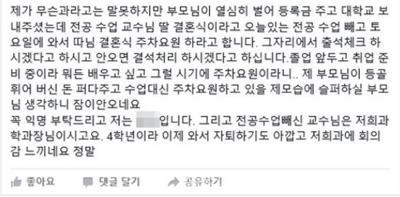 [아시아경제 정일웅 기자] ‘수업 빼줄 테니 주차요원으로 일해’ 대전의 한 사립대 전공과 교수(학과장)가 자신의 자녀 결혼식에 학생들을 동원하려다 망신살을 뻗쳤다.지난달 30일 대전 A대학 4학년 학생은 “전공 수업 교수님이 오늘 있는 전공 수업을 빼고 토요일에 와서 따님 결혼식 주차요원을 하라고 한다”며 “현장에서 출석체크를 하고 오지 않으면 결석처리를 하겠다고 하는데 (중략) 제 부모님이 등골 휘어 버신 돈 퍼다 주고 수업대신 주차요원을 하고 있을 제 모습에 슬퍼하실 부모님 생각하니 잠이 안오네요”라는 글을 페이스북(SNS)에 올렸다.이 학생은 “4학년이라 이제 와서 자퇴하기도 아깝고 우리 과에 회의감이 느껴지네요, 정말”이라고 자괴감을 드러내기도 했다.페이스북을 통해 게재된 이 글은 삽시간에 확산, 누리꾼들 사이의 ‘갑질’ 교수 논란으로도 이어졌다. 한 누리꾼은 “대전의 한 사립대 교수도 갑질 대열에 동참했다”며 “교수들의 갑질이 하루 이틀 일은 아니지만…언제나 되야 이런 일이 없어질지 앞날이 갑갑하다”고 혀를 찼다.다른 누리꾼들도 “교수 갑질에 어이가 없다”, “직권남용이 도를 넘어선 것 아닌가”, “지금이 어느 시대인데, (갑질) 교수의 행태가 이해되지 않는다”, “게재된 글 내용이 사실이라면 반드시 (해당 교수) 처벌해야 한다” 등의 반응을 보이며 갑질 논란을 부추겼다.온라인상에서 교수 '갑질' 논란이 불거지자 해당 교수는 뒤늦게 결혼식에 참석하지 않아도 된다는 문자를 학생들에게 발송했다. 페이스북 캡쳐