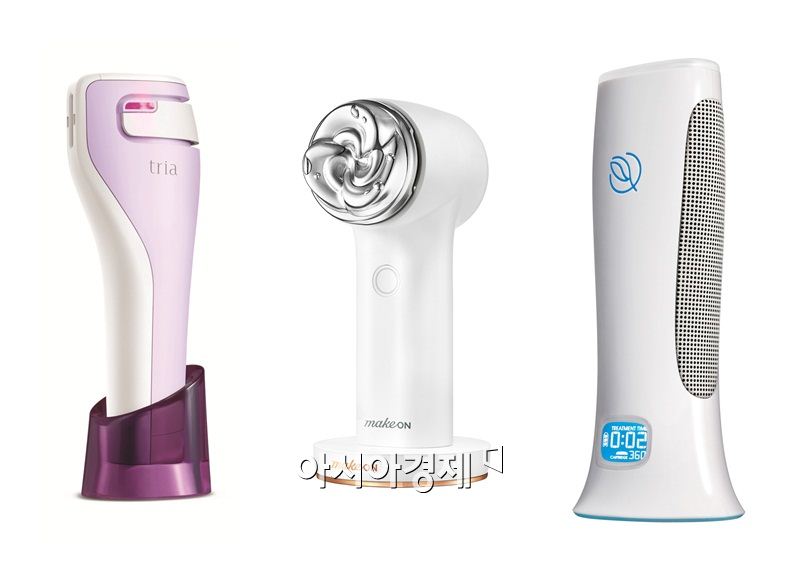 왼쪽부터 트리아 스킨 리뉴 레이저, 메이크온 클렌징 인핸서, 트리아 스킨 퍼펙팅 블루 라이트