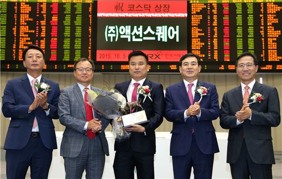 한국거래소 코스닥시장본부는 5일 오전 서울사옥 홍보관에서 모바일 게임 개발업체인 액션스퀘어의 코스닥시장 신규상장 기념식을 개최했다. 액션스퀘어는 2012년 8월에 설립된 모바일 롤플레잉게임(RPG) '블레이드' 개발사로 '케이비제4호기업인수목적 주식회사'와의 합병을 통해 이날 코스닥시장에 상장했다. 사진 왼쪽부터 강홍기 한국IR협의회 부회장, 임승원 한국거래소 코스닥시장본부장보, 김재영 액션스퀘어 대표이사, 김성현 KB투자증권 전무, 김원식 코스닥협회 부회장 조유진 기자 tint@asiae.co.kr<ⓒ세계를 보는 창 경제를 보는 눈, 아시아경제(www.asiae.co.kr) 무단전재 배포금지>