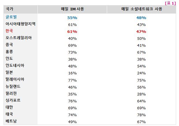 국가별 인터넷 이용자 중 인스턴트 메시징 앱, SNS 사용 비율(자료제공 : TNS)