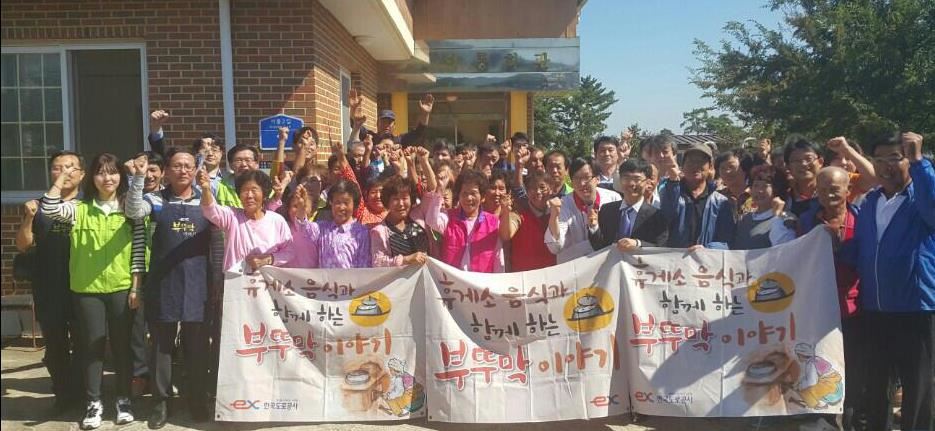 [한국도로공사 광주전남본부 직원들이 나주시 노안면 이룡마을에서 일손돕기 및 어르신 점심 대접을 한 뒤 주민들과 기념촬영을 하고 있다.]