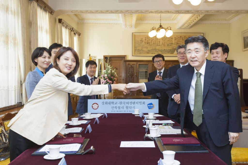 이영 한국여성벤처협회장(왼쪽)과 조인원 경희대 총장이 협약 체결 후 악수를 나누고 있다.