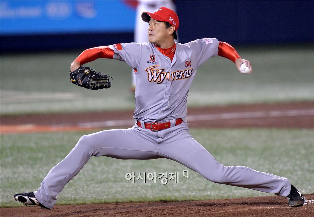 [목동=아시아경제 김현민 기자] 프로야구 2015 포스트시즌 SK 와이번스와 넥센 히어로즈의 와일드카드결정 1차전이 7일 목동구장에서 열렸다. SK 선발투수 김광현이 역투하고 있다. 김현민 기자 kimhyun81@asiae.co.kr<ⓒ세계를 보는 창 경제를 보는 눈, 아시아경제(www.asiae.co.kr) 무단전재 배포금지>