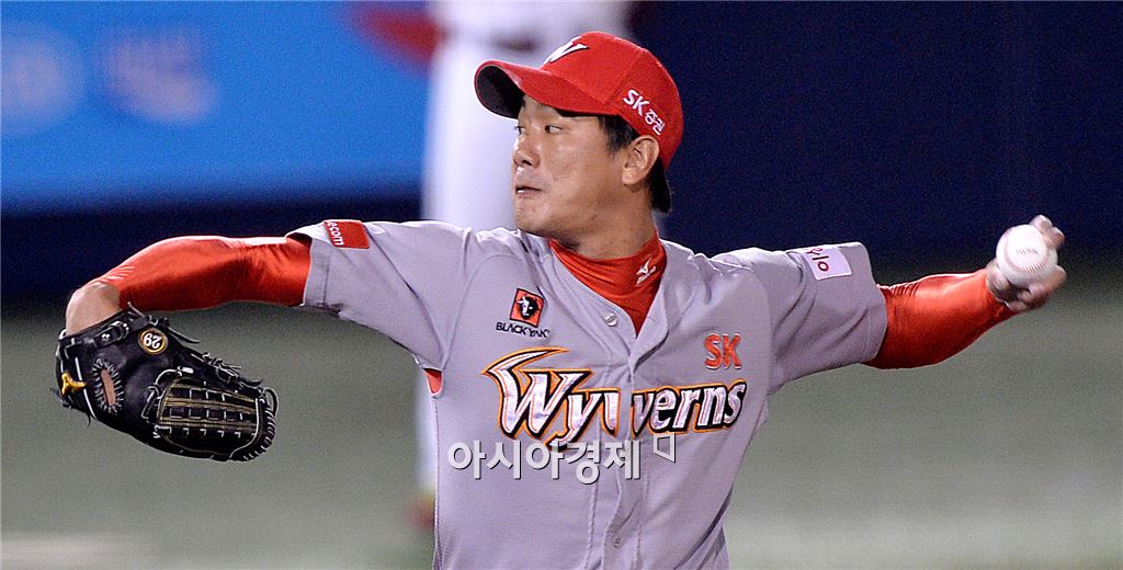 [목동=아시아경제 김현민 기자] 프로야구 2015 포스트시즌 SK 와이번스와 넥센 히어로즈의 와일드카드결정 1차전이 7일 목동구장에서 열렸다. SK 선발투수 김광현이 역투하고 있다. 김현민 기자 kimhyun81@asiae.co.kr<ⓒ세계를 보는 창 경제를 보는 눈, 아시아경제(www.asiae.co.kr) 무단전재 배포금지>