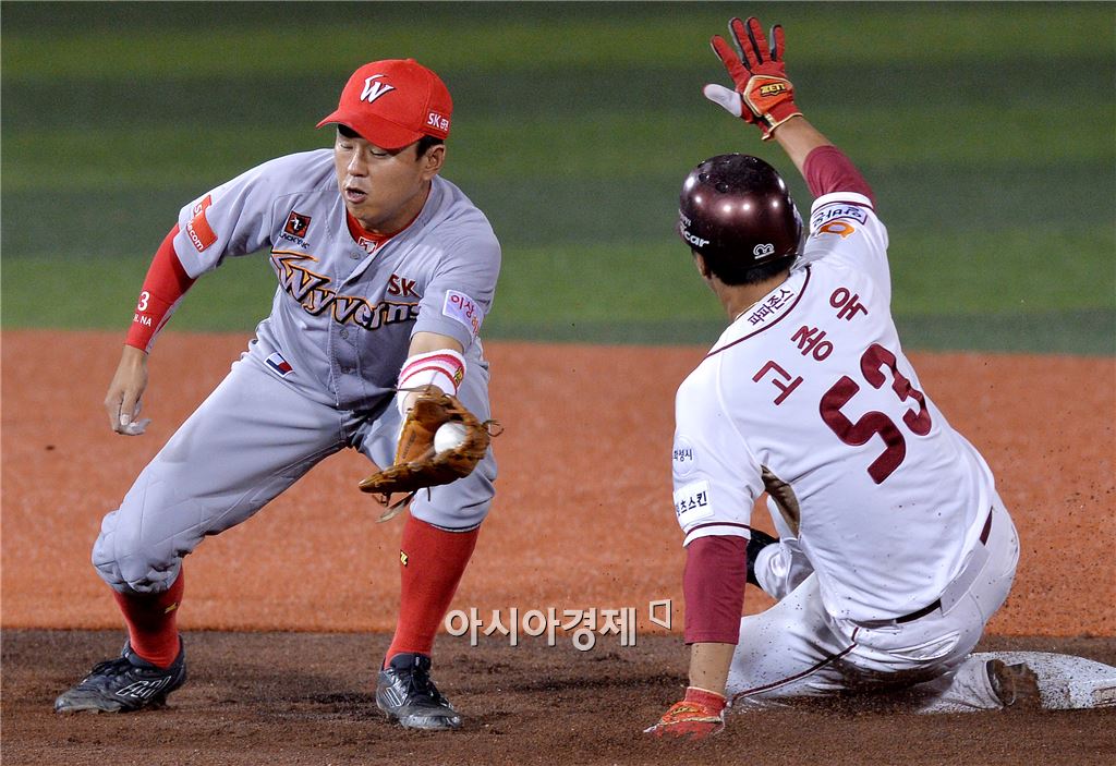[목동=아시아경제 김현민 기자] 프로야구 2015 포스트시즌 SK 와이번스와 넥센 히어로즈의 와일드카드결정 1차전이 7일 목동구장에서 열렸다. 1회말 1사 1루에서 넥센 이택근 타석 때 1루주자 고종욱이 2루 도루에 성공하고 있다. SK 2루수는 나주환.김현민 기자 kimhyun81@asiae.co.kr<ⓒ세계를 보는 창 경제를 보는 눈, 아시아경제(www.asiae.co.kr) 무단전재 배포금지>