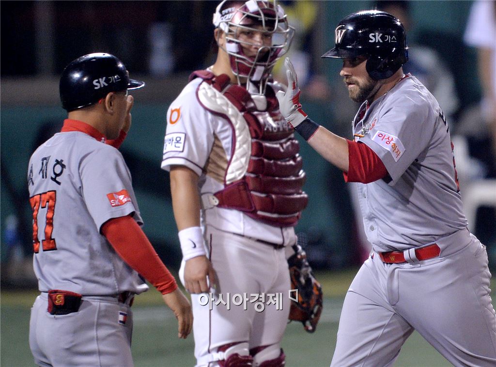 [목동=아시아경제 김현민 기자] 프로야구 2015 포스트시즌 SK 와이번스와 넥센 히어로즈의 와일드카드결정 1차전이 7일 목동구장에서 열렸다. 5회초 SK 선두타자 브라운이 넥센 선발 밴 헤켄을 상대로 동점 솔로 홈런을 치고 백재현 코치와 기쁨을 나누고 있다.김현민 기자 kimhyun81@asiae.co.kr<ⓒ세계를 보는 창 경제를 보는 눈, 아시아경제(www.asiae.co.kr) 무단전재 배포금지>