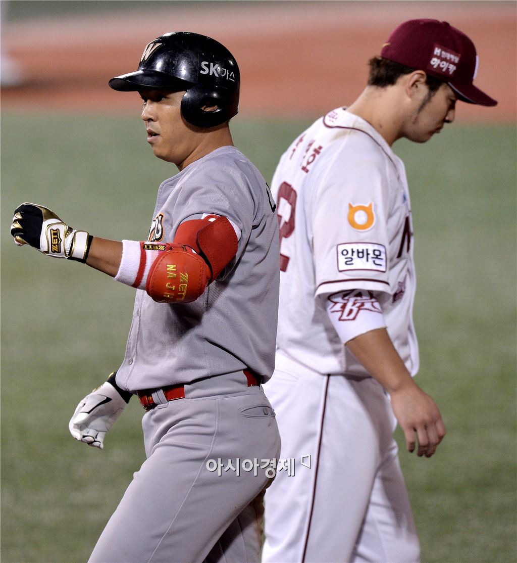[목동=아시아경제 김현민 기자] 프로야구 2015 포스트시즌 SK 와이번스와 넥센 히어로즈의 와일드카드결정 1차전이 7일 목동구장에서 열렸다. 7회초 2사 1루에서 SK 나주환이 중전 안타를 치고 출루한 뒤 백재현 코치와 하이파이브하고 있다. 넥센 1루수는 박병호.김현민 기자 kimhyun81@asiae.co.kr<ⓒ세계를 보는 창 경제를 보는 눈, 아시아경제(www.asiae.co.kr) 무단전재 배포금지>