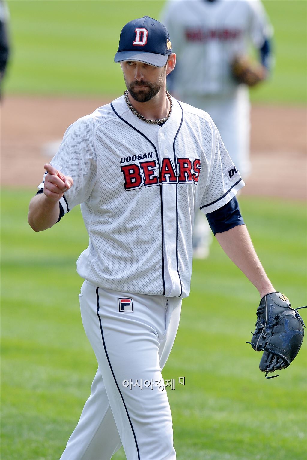 [잠실=아시아경제 김현민 기자] 프로야구 2015 포스트시즌 넥센 히어로즈와 두산 베어스의 준플레이오프 1차전이 10일 잠실구장에서 열렸다. 2회초 2사 1,2루에서 두산 선발 니퍼트가 넥센 김하성을 삼진으로 처리한 뒤 양의지 포수를 향해 손짓하고 있다. 김현민 기자 kimhyun81@asiae.co.kr<ⓒ세계를 보는 창 경제를 보는 눈, 아시아경제(www.asiae.co.kr) 무단전재 배포금지>
