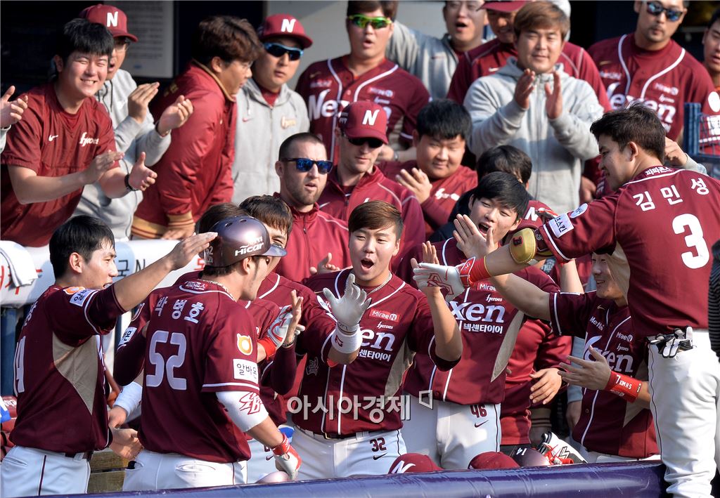[잠실=아시아경제 김현민 기자] 프로야구 2015 포스트시즌 넥센 히어로즈와 두산 베어스의 준플레이오프 1차전이 10일 잠실구장에서 열렸다. 6회초 2사에서 넥센 박병호가 두산 선발 니퍼트를 상대로 좌월 추가 솔로 홈런을 치고 동료들과 기쁨을 나누고 있다. 김현민 기자 kimhyun81@asiae.co.kr<ⓒ세계를 보는 창 경제를 보는 눈, 아시아경제(www.asiae.co.kr) 무단전재 배포금지>