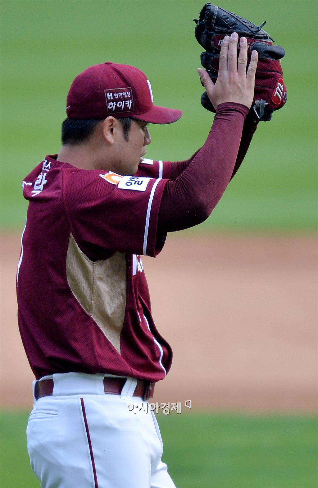 [잠실=아시아경제 김현민 기자] 프로야구 2015 포스트시즌 넥센 히어로즈와 두산 베어스의 준플레이오프 1차전이 10일 잠실구장에서 열렸다. 6회말 2사 1,2루에서 넥센 손승락이 두산 오재원을 2루수 땅볼로 처리한 뒤 박수치고 있다. 김현민 기자 kimhyun81@asiae.co.kr<ⓒ세계를 보는 창 경제를 보는 눈, 아시아경제(www.asiae.co.kr) 무단전재 배포금지>
