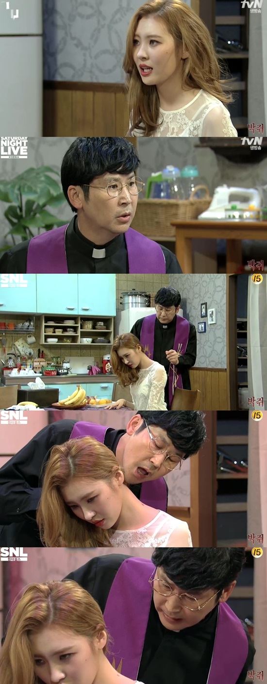 [아시아경제 온라인이슈팀]그룹 원더걸스의 멤버 선미가 방송인 신동엽을 유혹했다.10일 방송된 tvN 'SNL 코리아6'에서는 신동엽과 선미가 영화 '박쥐' 패러디 콩트를 선보이는 모습이 그려졌다. 이날 선미는 뱀파이어인 신동엽을 유혹하는 매혹적인 연기를 펼쳤다. 선미는 뱀파이어인 신동엽에게 "당신이 뱀파이어란 사실을 안다"며 "나를 뱀파이어로 만들어 이 칙칙한 곳에서 벗어나게 해 달라"고 부탁했다. 신동엽은 "신부로 산 시간이 길어 사람을 물어보지 못했다"고 선미의 제안을 거절했다. 이에 선미는 신동엽의 말에 오히려 "잘됐다. 신부님에게 첫 번째 여자이고 싶다"고 말해 아슬아슬한 '19금 발언'을 선보였다.결국 신동엽은 선미의 목을 물려고 시도했다. 하지만 신동엽은 선미의 목에 있는 이빨자국을 발견하곤 "처음이 아니다"라고 화를 냈다. 이에 선미는 "어릴 때 고양이에게 물렸던 것"이라 변명해 웃음을 자아냈다. 한편 이날 원더걸스의 유빈은 관객들의 뜨거운 반응에 "사실 우리가 노잼(재미가 없는) 그룹으로 유명한데 오늘 제대로 웃겨보고 싶다"고 밝혔다.온라인이슈팀 issue@asiae.co.kr<ⓒ세계를 보는 창 경제를 보는 눈, 아시아경제(www.asiae.co.kr) 무단전재 배포금지>