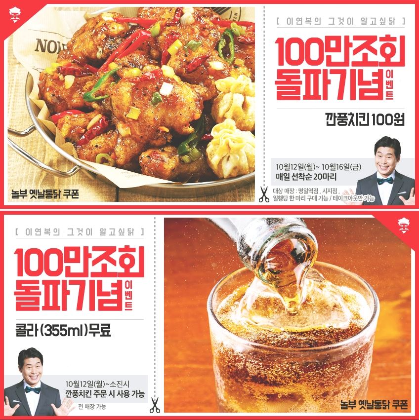 [아시아경제 조태진 기자]복고풍 가마솥 치킨 전문점 놀부옛날통닭이 홍보 영상 조회수 100만 돌파를 기념해 일부 매장에서 '깐풍치킨 100원 이벤트'를 실시한다고 12일 밝혔다.이번 행사는 지난 9월 이연복 셰프가 출연한 '이연복의 그것이 알고 싶닭(https://www.youtube.com/watch?v=QjHYXVjmQXA)' 동영상 조회수가 100만을 넘어선 것을 기념해 마련됐다.매장에서 한 마리 1만6000원에 판매되는 깐풍치킨을 오는 16일까지 100원에 구입할 수 있다. 놀부옛날통닭의 깐풍치킨은 매콤달콤한 특제 소스에 바삭한 치킨을 불맛 나게 볶은 것이 특징이며, 이연복 셰프도 인정한 맛의 '이연복 치킨'으로 알려져 있다. 참여 희망 고객은 놀부 공식 SNS 채널(블로그, 페이스북, 홈페이지)에서 쿠폰을 캡쳐하거나, 핸드폰 화면으로 쿠폰을 매장 직원에게 보여주면 된다. 이번 이벤트는 놀부옛날통닭 명일역점과 대구시지점에서 참여할 수 있으며, 각 매장당 하루 선착순 20명씩, 총 100명에게 혜택을 제공한다. 단, 포장 주문만 가능하다. 놀부옛날통닭은 전 매장에서 깐풍치킨 주문 고객 대상으로 콜라 무료 증정 이벤트도 실시한다. 조태진 기자 tjjo@asiae.co.kr<ⓒ세계를 보는 창 경제를 보는 눈, 아시아경제(www.asiae.co.kr) 무단전재 배포금지>
