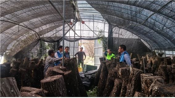 [화순군 산림조합 지도원들이 임업인들에게 표고버섯 원목재배에 관한 기술을 안내하고 있다.]