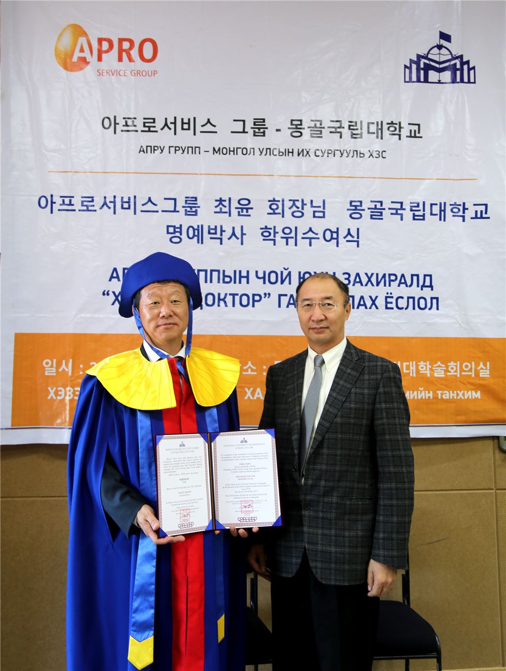 ▲최윤 OK저축은행 회장(왼쪽)이 9일 몽골 국립대학교에서 명예박사 학위를 받고 바트에르덴 몽골 국립대학교 총장과 기념 촬영을 하고 있다.