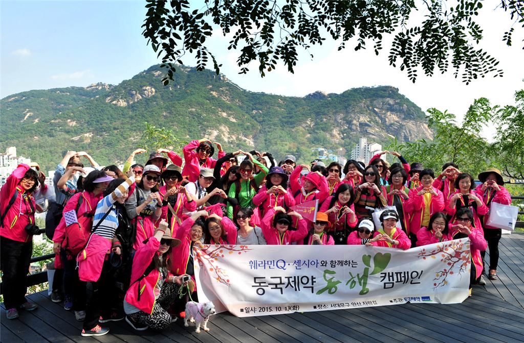 지난 13일 서울 서대문 안산에서 열린 동국제약 동행캠페인에 참가한 중년여성들이 기념사진을 찍고있다.