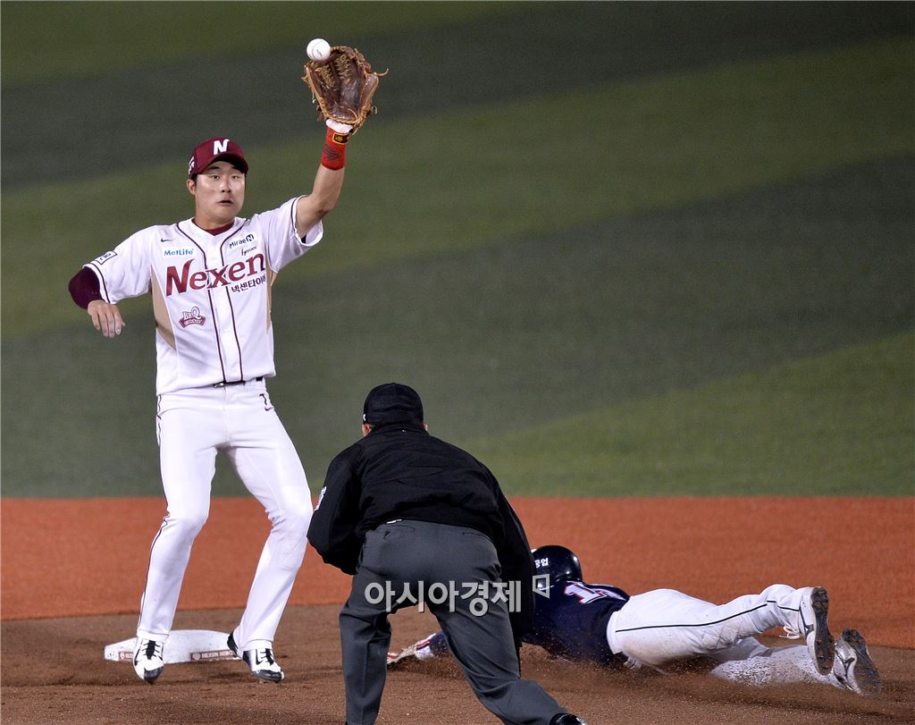 [목동=아시아경제 김현민 기자] 프로야구 2015 포스트시즌 두산 베어스와 넥센 히어로즈의 준플레이오프 4차전이 14일 목동구장에서 열렸다. 1회초 2사 1루에서 두산 김현수 타석 때 1루주자 허경민이 도루에 성공하고 있다. 넥센 유격수는 김하성.김현민 기자 kimhyun81@asiae.co.kr<ⓒ세계를 보는 창 경제를 보는 눈, 아시아경제(www.asiae.co.kr) 무단전재 배포금지>