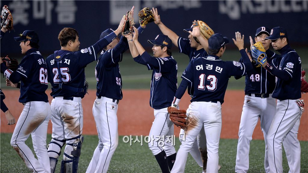 [목동=아시아경제 김현민 기자] 프로야구 두산 베어스가 14일 목동구장에서 열린 2015 포스트시즌 준플레이오프 4차전에서 넥센을 11-9로 꺾고 플레이오프 진출을 확정했다. 두산 선수들이 기뻐하고 있다.김현민 기자 kimhyun81@asiae.co.kr<ⓒ세계를 보는 창 경제를 보는 눈, 아시아경제(www.asiae.co.kr) 무단전재 배포금지>