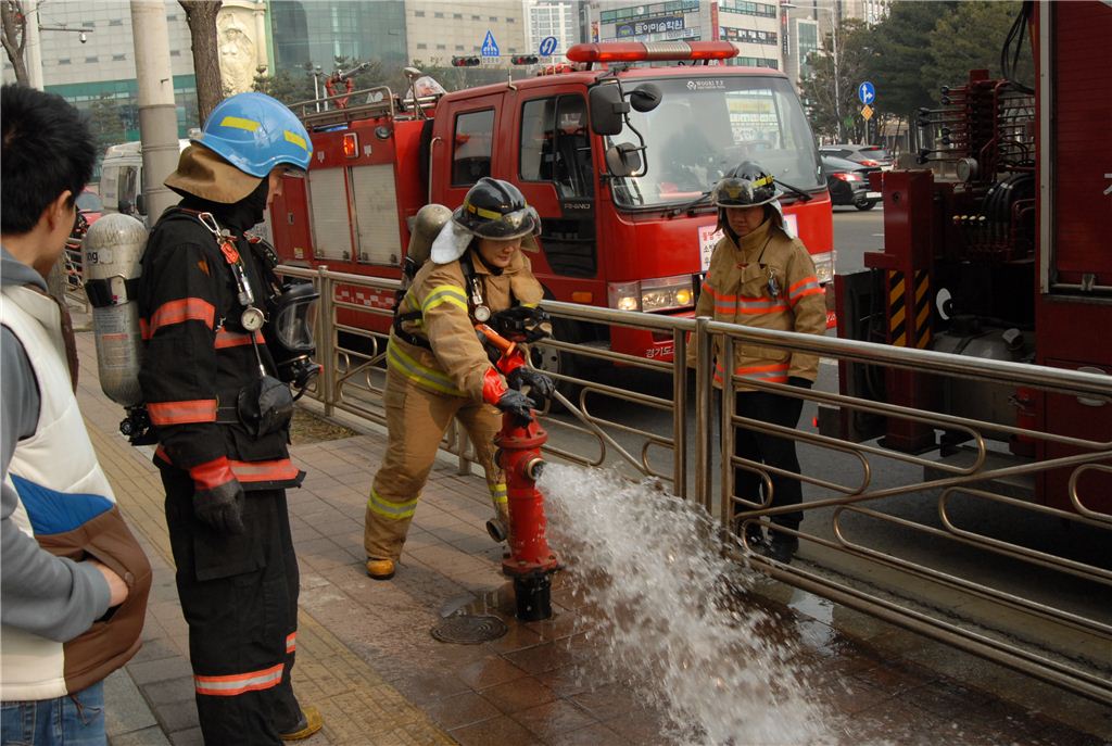 소방관이 소화전을 이용한 화재진화훈련을 하고 있다.