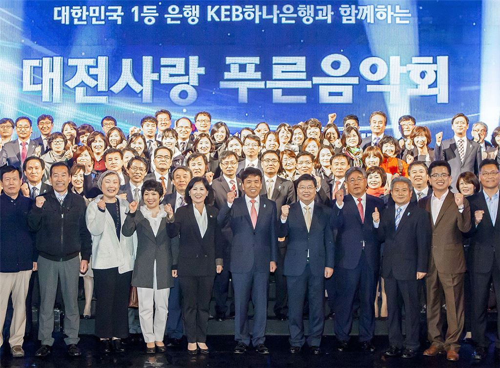 함영주 KEB하나은행장(앞줄 왼쪽 여섯번째)과 권선택 대전광역시장(왼쪽 일곱번째)이 14일 대전 엑스포 시민광장 특설무대에서 개최된 KEB하나은행 '대전사랑 푸른 음악회'에서 참석 내외빈과 기념촬영을 하고 있다. (자료:KEB하나은행)