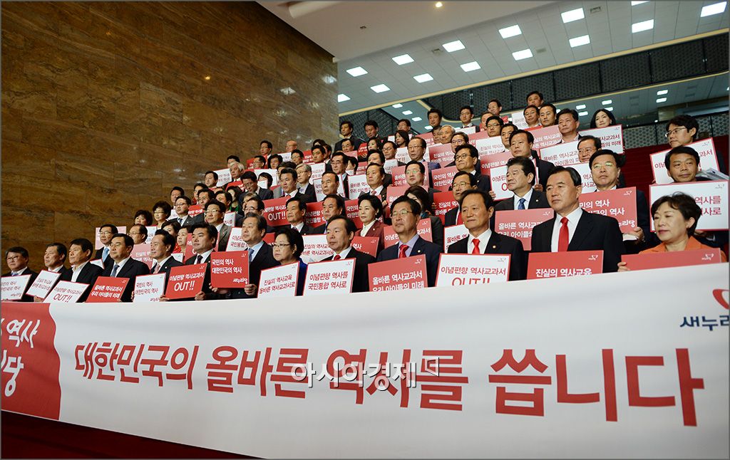 [아시아경제 윤동주 기자] 김무성 새누리당 대표와 원유철 원내대표 등 의원들이 15일 국회 본청 로덴더 홀 계단에서 '올바른 역사 교과서 만들기 결의대회'를 갖고 있다.윤동주 기자 doso7@asiae.co.kr<ⓒ세계를 보는 창 경제를 보는 눈, 아시아경제(www.asiae.co.kr) 무단전재 배포금지>