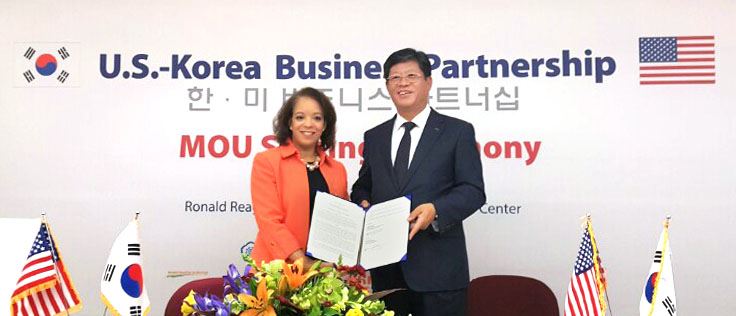 KOTRA가 14일 워싱턴에서 개최한 '한미 비즈니스 파트너십'에서 미국 MBDA(미 상무부 산하 소수계기업지원청)와 정부조달 협력 MOU를 체결했다. 좌측 MBDA 알레잔드라 카스틸로 청장, 오른쪽 KOTRA 김재홍 사장
