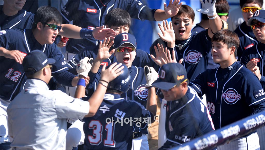 [마산=아시아경제 김현민 기자] 프로야구 2015 포스트시즌 두산 베어스와 NC 다이노스의 플레이오프 1차전이 18일 마산야구장에서 열렸다. 1회초 1사 1,3루에서 두산 김현수 타석 때 NC 선발 해커의 폭투로 선취득점한 3루주자 정수빈이 동료들의 환영을 받고 있다. 김현민 기자 kimhyun81@asiae.co.kr<ⓒ세계를 보는 창 경제를 보는 눈, 아시아경제(www.asiae.co.kr) 무단전재 배포금지>