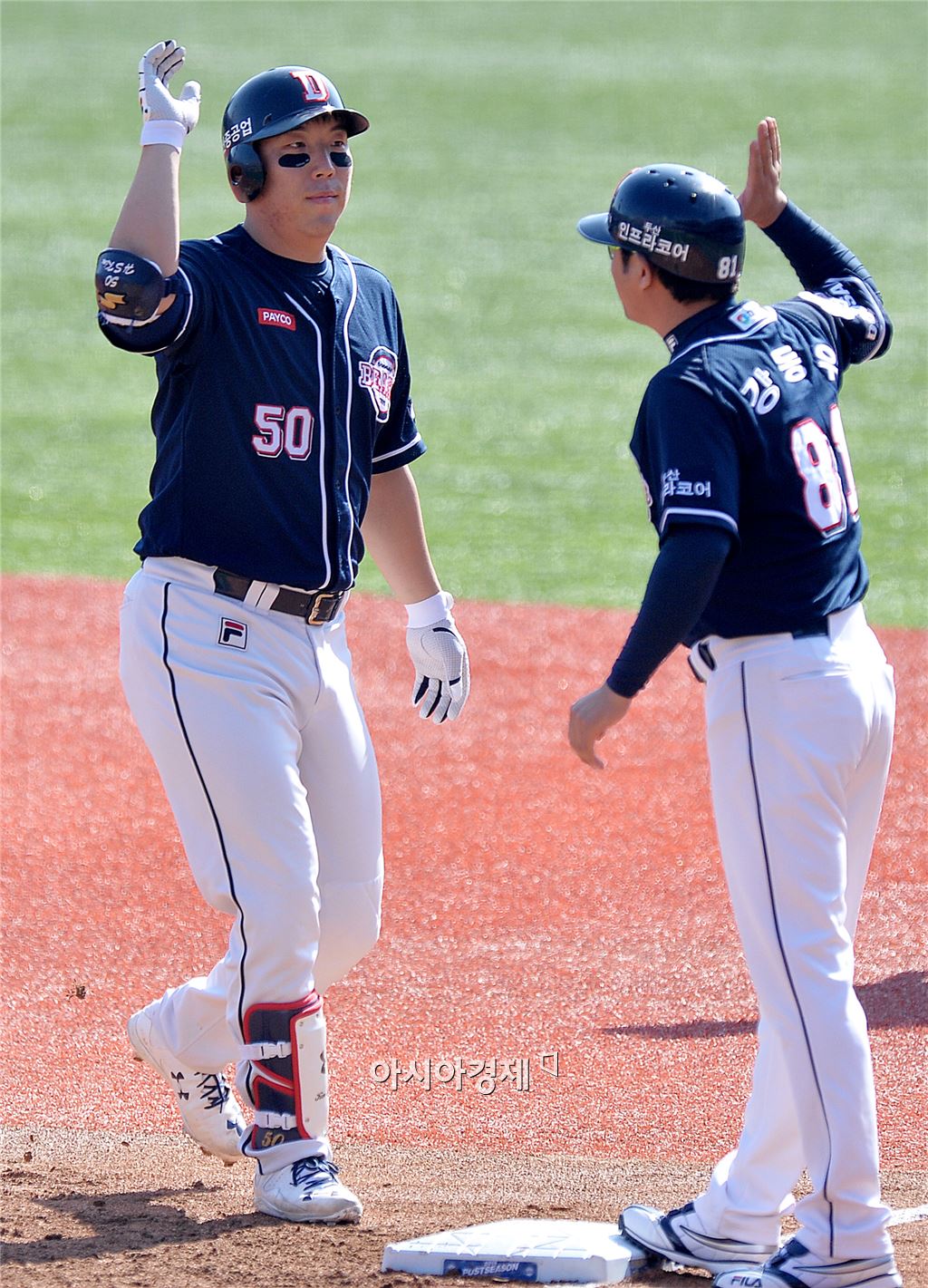 [마산=아시아경제 김현민 기자] 프로야구 2015 포스트시즌 두산 베어스와 NC 다이노스의 플레이오프 1차전이 18일 마산야구장에서 열렸다. 1회초 1사 2루에서 두산 김현수가 추가 1타점 적시타를 치고 강동우 코치와 하이파이브하고 있다. 김현민 기자 kimhyun81@asiae.co.kr<ⓒ세계를 보는 창 경제를 보는 눈, 아시아경제(www.asiae.co.kr) 무단전재 배포금지>