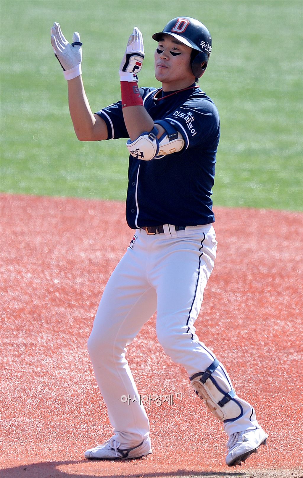 [마산=아시아경제 김현민 기자] 프로야구 2015 포스트시즌 두산 베어스와 NC 다이노스의 플레이오프 1차전이 18일 마산야구장에서 열렸다. 1회초 무사 1루에서 두산 허경민이 좌전 안타로 출루한 뒤 박수를 치고 있다. 김현민 기자 kimhyun81@asiae.co.kr<ⓒ세계를 보는 창 경제를 보는 눈, 아시아경제(www.asiae.co.kr) 무단전재 배포금지>
