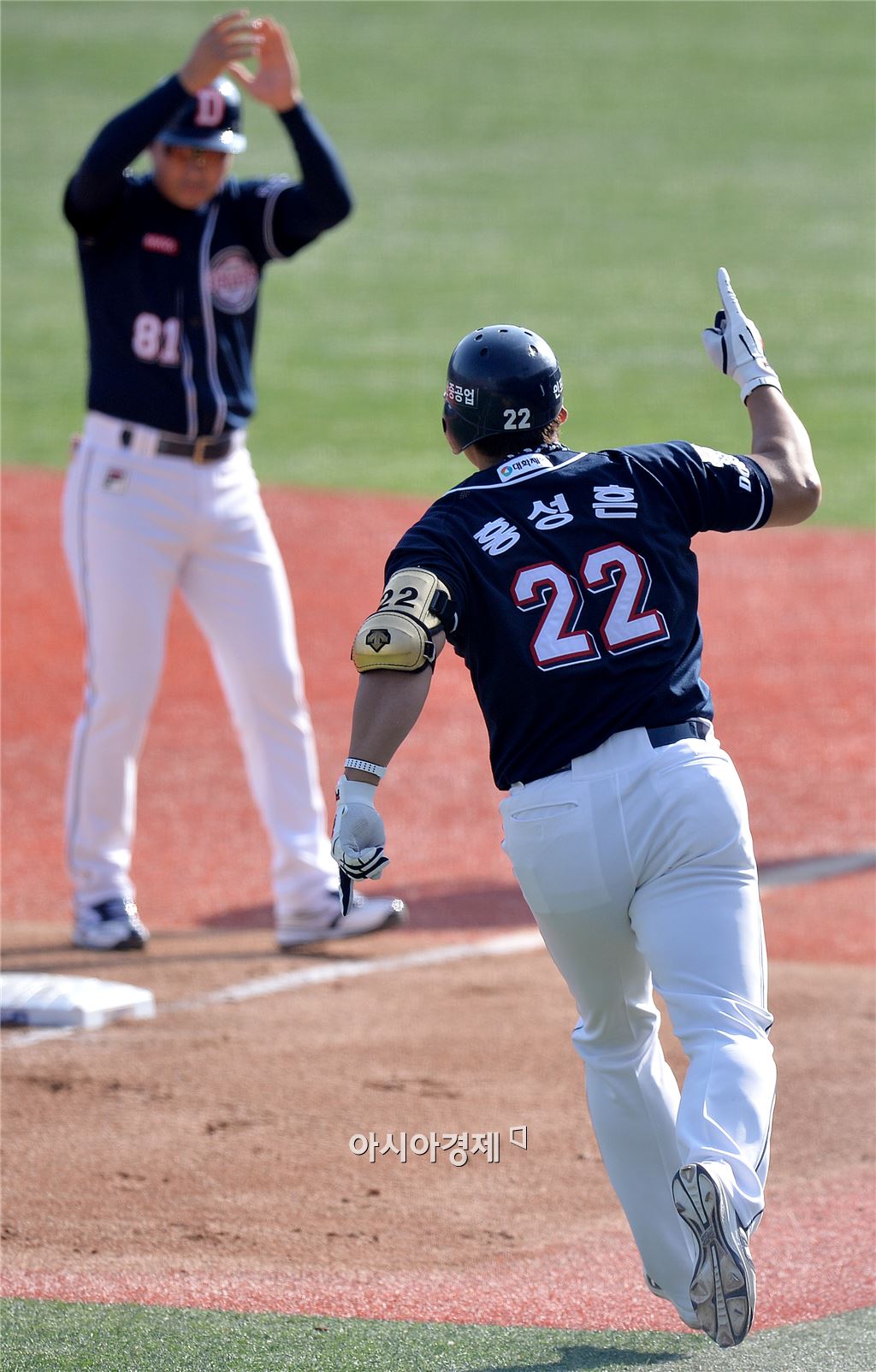 [마산=아시아경제 김현민 기자] 프로야구 2015 포스트시즌 두산 베어스와 NC 다이노스의 플레이오프 1차전이 18일 마산야구장에서 열렸다. 4회초 1사에서 두산 홍성흔이 NC 선발 해커를 상대로 좌중간 추가 솔로 홈런을 치고 기뻐하고 있다. 김현민 기자 kimhyun81@asiae.co.kr<ⓒ세계를 보는 창 경제를 보는 눈, 아시아경제(www.asiae.co.kr) 무단전재 배포금지>