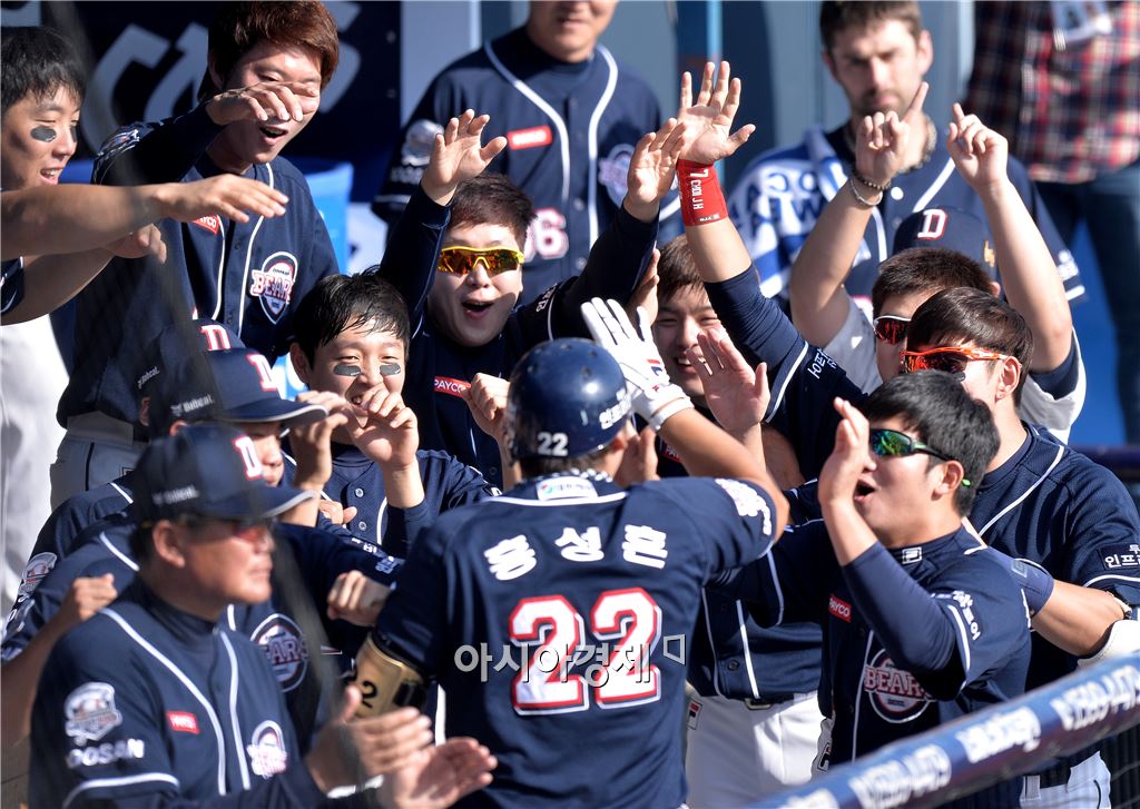 [마산=아시아경제 김현민 기자] 프로야구 2015 포스트시즌 두산 베어스와 NC 다이노스의 플레이오프 1차전이 18일 마산야구장에서 열렸다. 4회초 1사에서 두산 홍성흔이 NC 선발 해커를 상대로 좌중간 추가 솔로 홈런을 치고 더그아웃의 동료들과 기뻐하고 있다. 김현민 기자 kimhyun81@asiae.co.kr<ⓒ세계를 보는 창 경제를 보는 눈, 아시아경제(www.asiae.co.kr) 무단전재 배포금지>