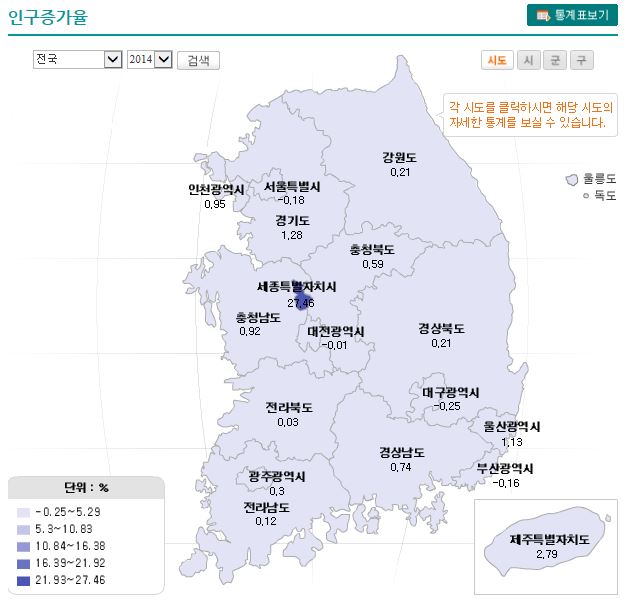 [아시아경제(대전) 정일웅 기자] 지난해 대전지역 인구 증가율이 2003년 이후 처음으로 마이너스 성장세를 기록했다. 반면 세종시는 전국에서 유일하게 20%대, 이외에 충남·북을 포함한 대부분 지역은 소수점 이하의 증가율을 나타내며 대비를 이뤘다.19일 국가통계포털(kosis)과 e-지방지표 등에 따르면 지난해 전국 시도별 인구증가율 현황에서 대전은 전년대비(2013년) 0.01%의 인구가 줄어든 것으로 집계된다.전국 17개 시도별 인구 증가율 현황. e-지방지표 ‘인구 증가율’ 현황자료 캡쳐