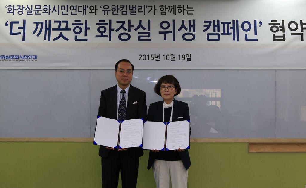 권오승 유한킴벌리 상무(왼쪽)와 표혜령 화장실문화시민연대 대표가 19일 화장실 위생캠페인을 위한 협약을 체결한 후 기념촬영을 하고 있다.