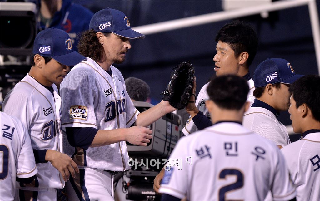 [마산=아시아경제 김현민 기자] 프로야구 2015 포스트시즌 두산 베어스와 NC 다이노스의 플레이오프 2차전이 19일 마산구장에서 열렸다. NC 선발투수 스튜어트가 1회초 수비를 무실점으로 막고 동료들과 하이파이브하고 있다. 김현민 기자 kimhyun81@asiae.co.kr<ⓒ세계를 보는 창 경제를 보는 눈, 아시아경제(www.asiae.co.kr) 무단전재 배포금지>
