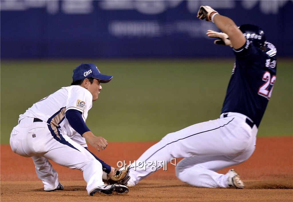 [마산=아시아경제 김현민 기자] 프로야구 2015 포스트시즌 두산 베어스와 NC 다이노스의 플레이오프 2차전이 19일 마산구장에서 열렸다. 5회초 1사 1루에서 두산 오재원 타석 때 도루를 시도한 1루주자 홍성흔이 NC 유격수 손시헌에 태그아웃되고 있다. 김현민 기자 kimhyun81@asiae.co.kr<ⓒ세계를 보는 창 경제를 보는 눈, 아시아경제(www.asiae.co.kr) 무단전재 배포금지>