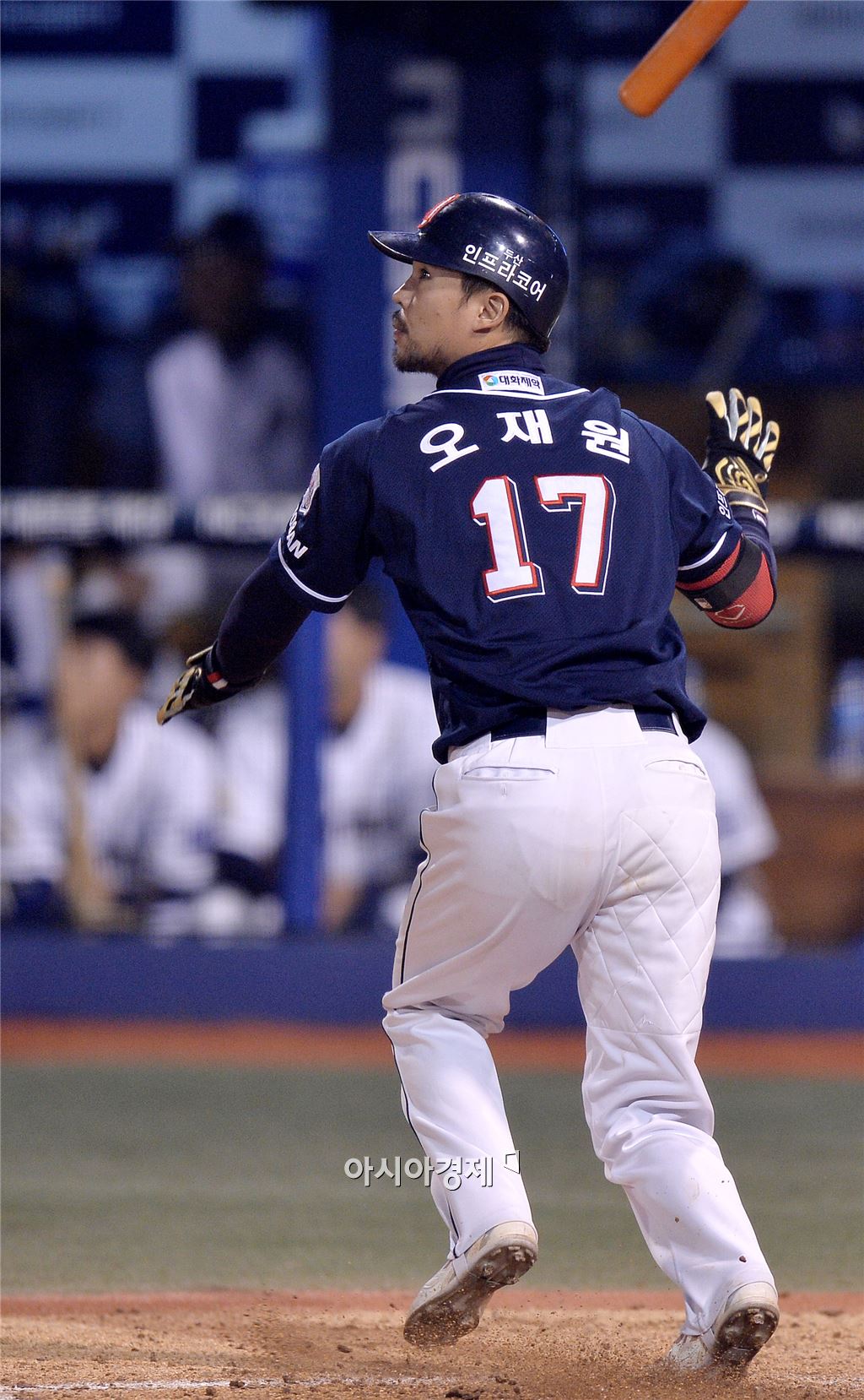 [마산=아시아경제 김현민 기자] 프로야구 2015 포스트시즌 두산 베어스와 NC 다이노스의 플레이오프 2차전이 19일 마산구장에서 열렸다. 8회초 1사에서 두산 오재원이 NC 선발 스튜어트를 상대로 중월 선제 솔로 홈런을 치고 있다. 김현민 기자 kimhyun81@asiae.co.kr<ⓒ세계를 보는 창 경제를 보는 눈, 아시아경제(www.asiae.co.kr) 무단전재 배포금지>
