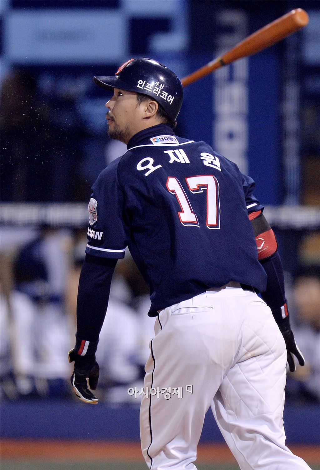 [마산=아시아경제 김현민 기자] 프로야구 2015 포스트시즌 두산 베어스와 NC 다이노스의 플레이오프 2차전이 19일 마산구장에서 열렸다. 8회초 1사에서 두산 오재원이 NC 선발 스튜어트를 상대로 중월 선제 솔로 홈런을 치고 있다. 김현민 기자 kimhyun81@asiae.co.kr<ⓒ세계를 보는 창 경제를 보는 눈, 아시아경제(www.asiae.co.kr) 무단전재 배포금지>