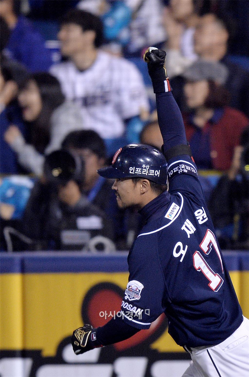 [마산=아시아경제 김현민 기자] 프로야구 2015 포스트시즌 두산 베어스와 NC 다이노스의 플레이오프 2차전이 19일 마산구장에서 열렸다. 8회초 1사에서 두산 오재원이 NC 선발 스튜어트를 상대로 중월 선제 솔로 홈런을 치고 베이스를 돌며 환호하고 있다. 김현민 기자 kimhyun81@asiae.co.kr<ⓒ세계를 보는 창 경제를 보는 눈, 아시아경제(www.asiae.co.kr) 무단전재 배포금지>