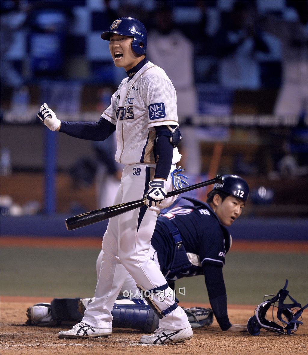 [마산=아시아경제 김현민 기자] 프로야구 2015 포스트시즌 두산 베어스와 NC 다이노스의 플레이오프 2차전이 19일 마산구장에서 열렸다. 8회말 1사 3루에서 NC 대타 김성욱이 상대 폭투로 역전에 성공하자 환호하고 있다. 김현민 기자 kimhyun81@asiae.co.kr<ⓒ세계를 보는 창 경제를 보는 눈, 아시아경제(www.asiae.co.kr) 무단전재 배포금지>