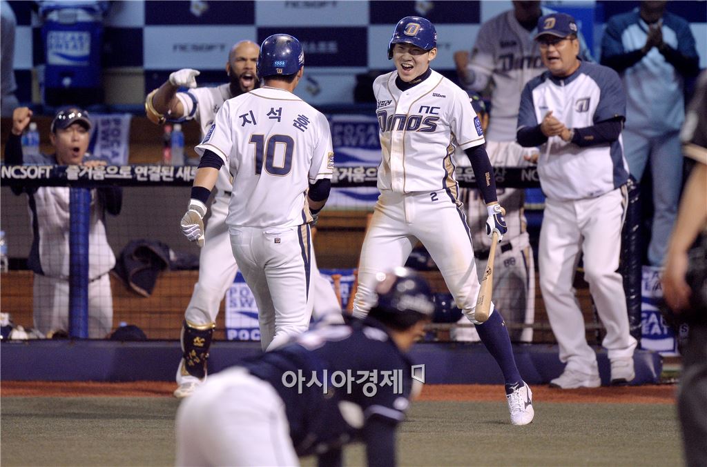 [마산=아시아경제 김현민 기자] 프로야구 2015 포스트시즌 두산 베어스와 NC 다이노스의 플레이오프 2차전이 19일 마산구장에서 열렸다. 8회말 1사 3루에서 NC 대타 김성욱 타석 때 상대 폭투를 틈타 역전 득점에 성공한 3루주자 지석훈이 대기타석의 박민우와 기뻐하고 있다. 김현민 기자 kimhyun81@asiae.co.kr<ⓒ세계를 보는 창 경제를 보는 눈, 아시아경제(www.asiae.co.kr) 무단전재 배포금지>