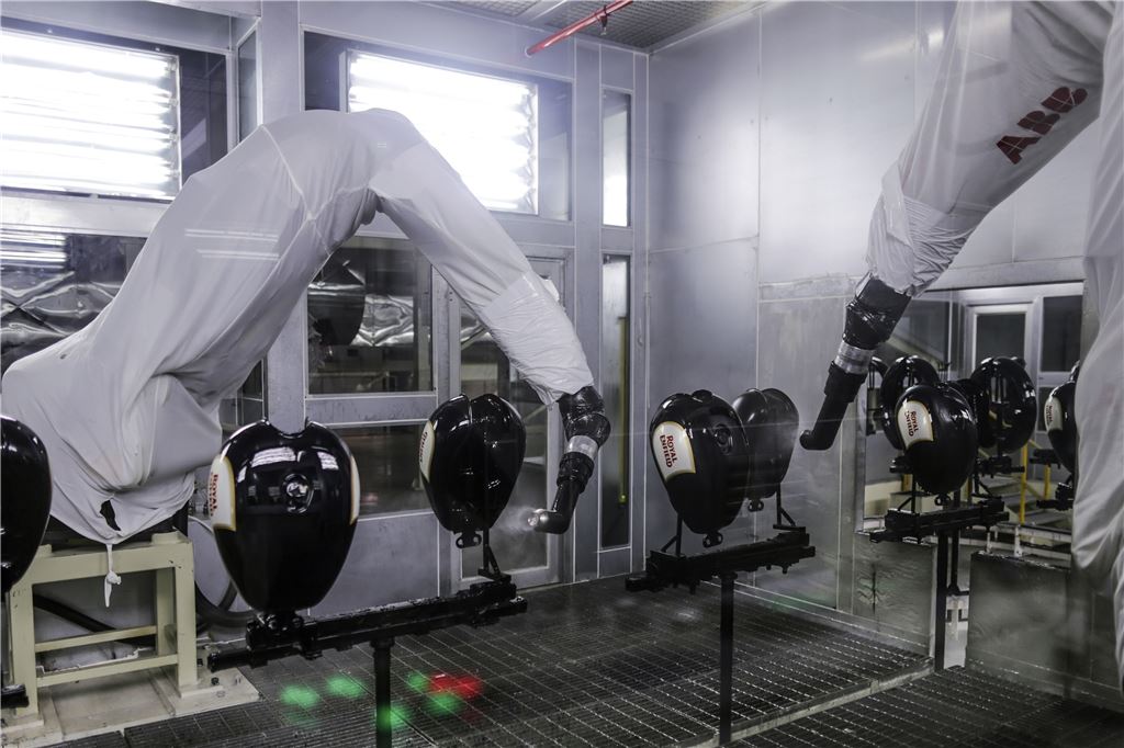 인도 타밀나두주 첸나이의 모터사이클 제조업체 로열 인필드에서 로봇들이 위험한 도장작업을 수행하고 있다. 노동자가 직접 도장할 경우 독성 페인트 분무에 노출돼 기억력과 인지기능이 떨어질 수 있다(사진=블룸버그뉴스).