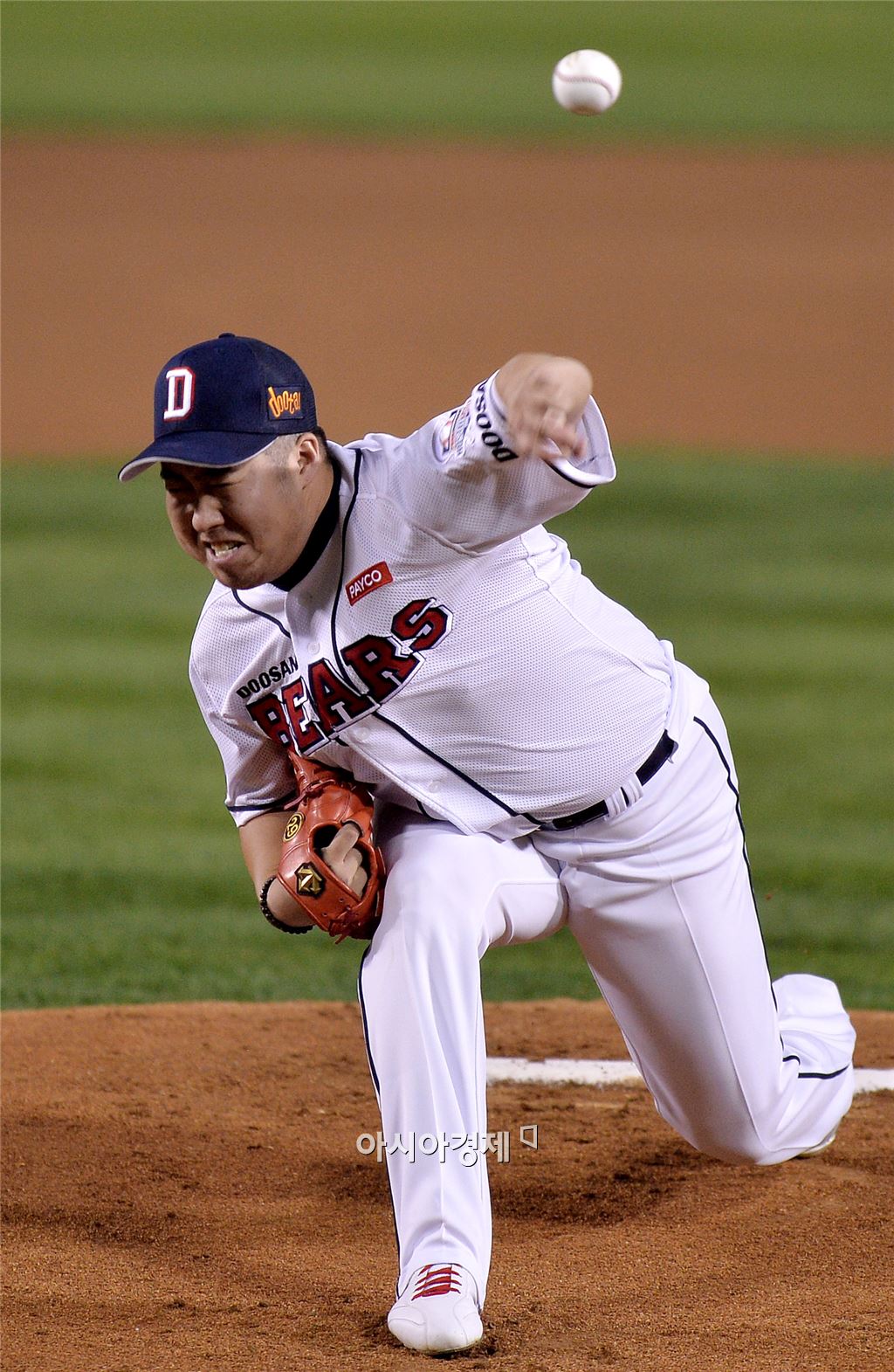[잠실=아시아경제 김현민 기자] 프로야구 2015 포스트시즌 NC 다이노스와 두산 베어스의 플레이오프 3차전이 21일 잠실구장에서 열렸다. 두산 선발투수 유희관이 역투하고 있다. 김현민 기자 kimhyun81@asiae.co.kr<ⓒ세계를 보는 창 경제를 보는 눈, 아시아경제(www.asiae.co.kr) 무단전재 배포금지>