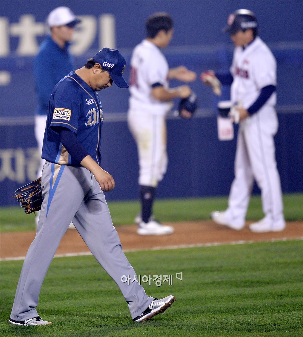 [잠실=아시아경제 김현민 기자] 프로야구 2015 포스트시즌 NC 다이노스와 두산 베어스의 플레이오프 3차전이 21일 잠실구장에서 열렸다. NC 선발 손민한이 2회말 2사 1루에서 두산 정수빈에게 동점 1타점 좌중간 3루타를 허용한 뒤 아쉬워하고 있다. 김현민 기자 kimhyun81@asiae.co.kr<ⓒ세계를 보는 창 경제를 보는 눈, 아시아경제(www.asiae.co.kr) 무단전재 배포금지>