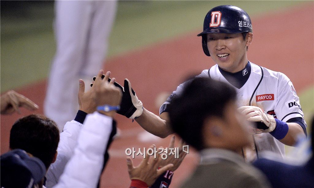[잠실=아시아경제 김현민 기자] 프로야구 2015 포스트시즌 NC 다이노스와 두산 베어스의 플레이오프 3차전이 21일 잠실구장에서 열렸다. 2회말 2사 3루에서 두산 허경민의 2루수 땅볼 때 상대 실책을 틈타 득점을 올린 3루주자 정수빈이 동료들과 기뻐하고 있다. 김현민 기자 kimhyun81@asiae.co.kr<ⓒ세계를 보는 창 경제를 보는 눈, 아시아경제(www.asiae.co.kr) 무단전재 배포금지>