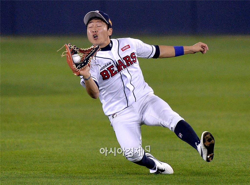 [잠실=아시아경제 김현민 기자] 프로야구 2015 포스트시즌 NC 다이노스와 두산 베어스의 플레이오프 3차전이 21일 잠실구장에서 열렸다. 3회초 1사 2루에서 두산 중견수 정수빈이 NC 지석훈의 타구를 잡아내고 있다. 김현민 기자 kimhyun81@asiae.co.kr<ⓒ세계를 보는 창 경제를 보는 눈, 아시아경제(www.asiae.co.kr) 무단전재 배포금지>