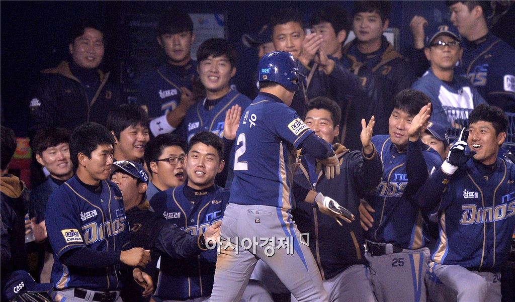 [잠실=아시아경제 김현민 기자] 프로야구 2015 포스트시즌 NC 다이노스와 두산 베어스의 플레이오프 3차전이 21일 잠실구장에서 열렸다. 3회초 1사 1,2루에서 NC 테임즈의 동점 1타점 적시타 때 득점을 올린 2루주자 박민우가 더그아웃의 동료들과 기뻐하고 있다. 김현민 기자 kimhyun81@asiae.co.kr<ⓒ세계를 보는 창 경제를 보는 눈, 아시아경제(www.asiae.co.kr) 무단전재 배포금지>