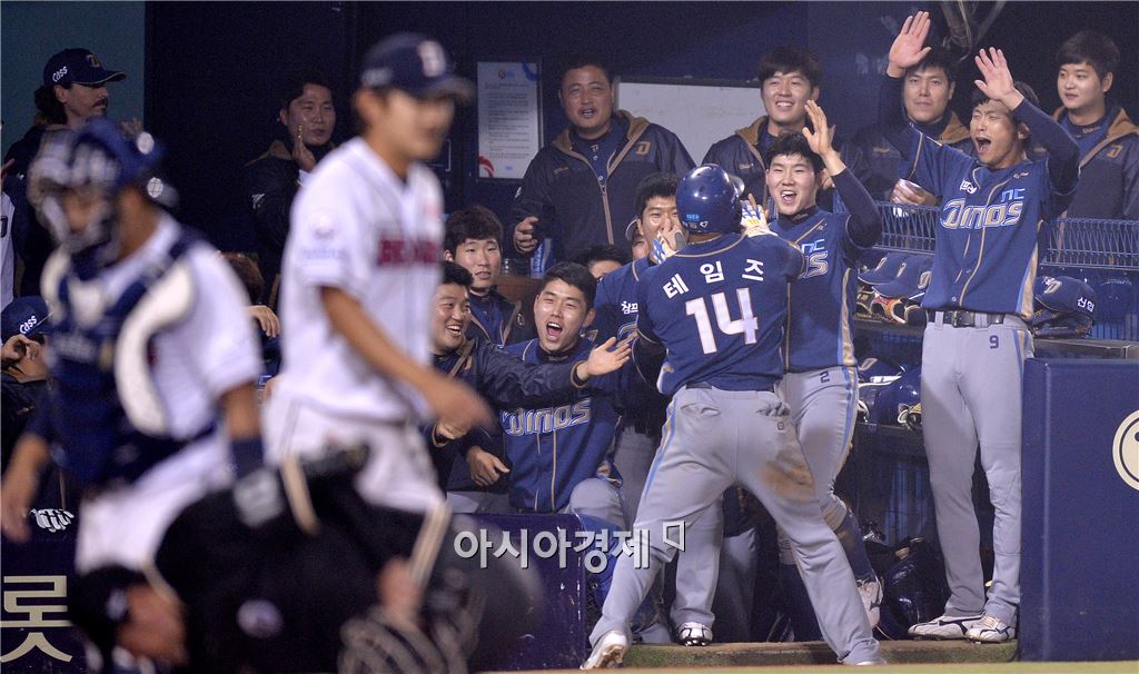[잠실=아시아경제 김현민 기자] 프로야구 2015 포스트시즌 NC 다이노스와 두산 베어스의 플레이오프 3차전이 21일 잠실구장에서 열렸다. 3회초 1사 1,2루에서 NC 이종욱의 추가 1타점 적시타 때 득점을 올린 2루주자 테임즈가 동료들과 기뻐하고 있다. 김현민 기자 kimhyun81@asiae.co.kr<ⓒ세계를 보는 창 경제를 보는 눈, 아시아경제(www.asiae.co.kr) 무단전재 배포금지>