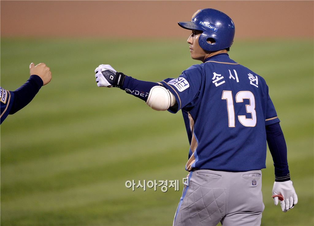 [잠실=아시아경제 김현민 기자] 프로야구 2015 포스트시즌 NC 다이노스와 두산 베어스의 플레이오프 3차전이 21일 잠실구장에서 열렸다. 3회초 1사 1,2루에서 NC 손시헌이 추가 1타점 적시타를 치고 전준호 코치와 하이파이브하고 있다. 김현민 기자 kimhyun81@asiae.co.kr<ⓒ세계를 보는 창 경제를 보는 눈, 아시아경제(www.asiae.co.kr) 무단전재 배포금지>