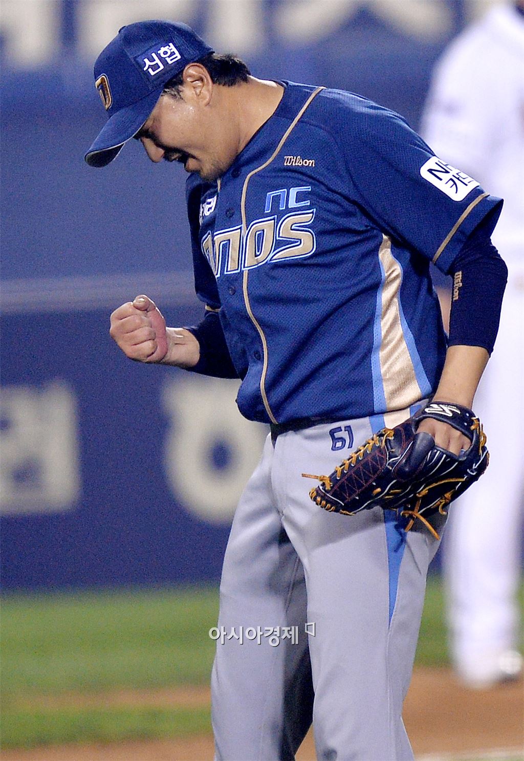 [잠실=아시아경제 김현민 기자] 프로야구 2015 포스트시즌 NC 다이노스와 두산 베어스의 플레이오프 3차전이 21일 잠실구장에서 열렸다. NC 선발 손민한이 4회말 2사 1,2루에서 두산 허경민을 유격수 땅볼로 처리한 뒤 주먹을 쥐며 기뻐하고 있다. 김현민 기자 kimhyun81@asiae.co.kr<ⓒ세계를 보는 창 경제를 보는 눈, 아시아경제(www.asiae.co.kr) 무단전재 배포금지>