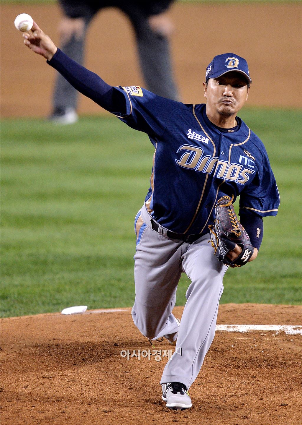 [잠실=아시아경제 김현민 기자] 프로야구 2015 포스트시즌 NC 다이노스와 두산 베어스의 플레이오프 3차전이 21일 잠실구장에서 열렸다. NC 선발투수 손민한이 역투하고 있다.